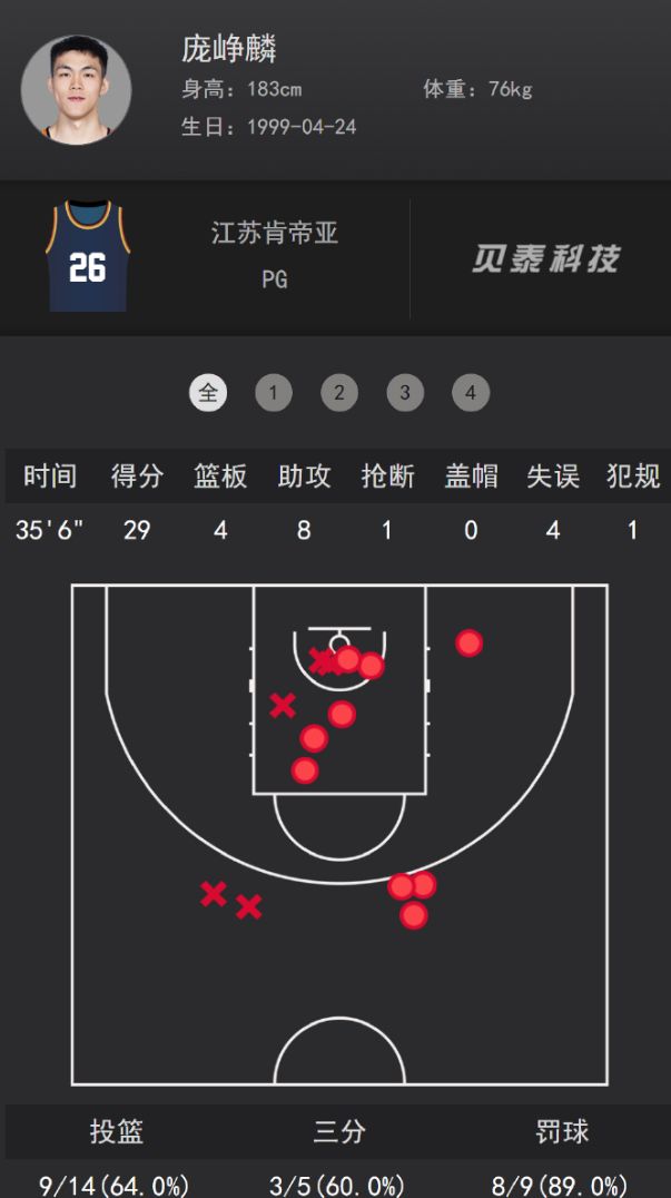此役庞峥麟35分钟,14中9,三分5中3,罚球9中8,拿到29分8助攻4篮板1抢断,命中率64%,三分命中率60%,罚球命中率89%,正负值+28。