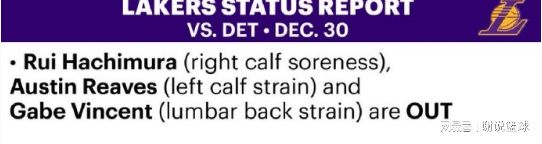 本赛季目前为止,两队战绩都很不错,湖人轻取国王后,重回西部前四行列,活塞则持续进化,直接高居东部榜首。而在这场焦点对决前,湖人迎战东部榜首却面临考验,从官方给出的伤病报告来看,湖人这边局势不妙,先发四号位八村塁伤情反复,他预计因为小腿酸痛缺阵,此外里夫斯和文森特继续养伤,好消息是替补中锋海斯有望回归登场。