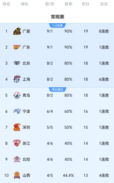 随着广厦双杀北京,广东险胜北控,上海6连胜,CBA最新积分榜出炉