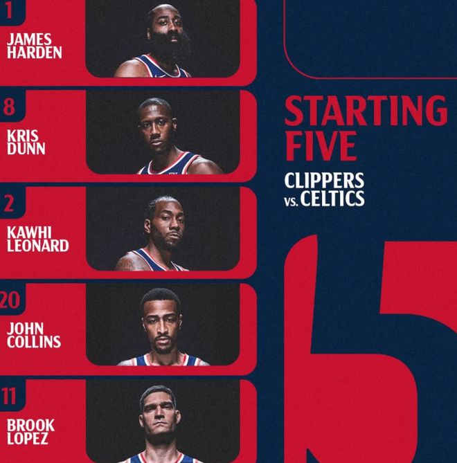 首发阵容方面,快船队这边,祖巴茨迎来复出,保罗继续未随队,泰伦卢排出的最新首发五人组为:詹姆斯-哈登、克里斯-邓恩、科怀-伦纳德、约翰-科林斯和布鲁克-洛佩斯;凯尔特人队这边,首发阵容则为:德里克-怀特、佩顿-普里查德、杰伦-布朗、萨姆-豪瑟和内米亚斯-克塔。