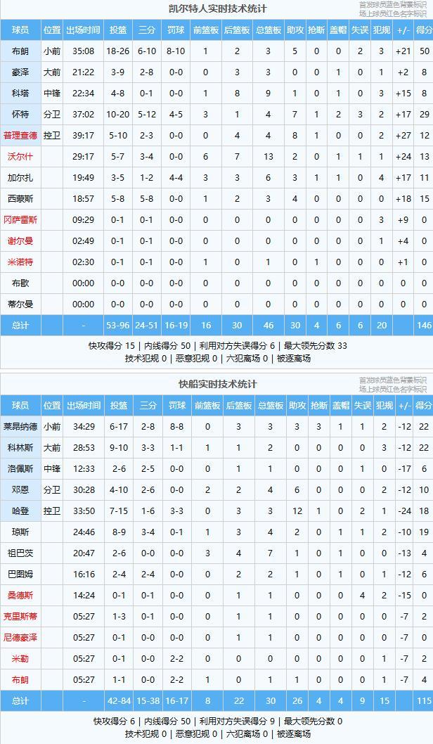 杰伦·布朗和怀特依旧手感火热,哈登和莱昂纳德也能够及时拿分回应,两队陷入拉锯战,第三节尾声杰伦·布朗再度爆发一波帮助凯尔特人又将分差拉大到两位数。末节刚开打没多久琼斯受伤离场,杰伦·布朗依旧手感火热不断拿分,场上分差被拉大到20分以上,快船在还剩5分钟时撤下主力宣告投降,最终凯尔特人146-115轻取快船取得3连胜,快船6连胜被终结。