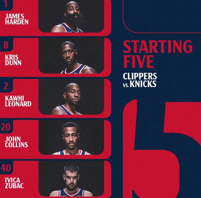 首发阵容方面,快船队这边,比尔缺阵,保罗继续未随队,哈登迎来复出,泰伦卢教练排出的最新首发五人组为:詹姆斯-哈登、克里斯-邓恩、科怀-伦纳德、约翰-科林斯、祖巴茨;尼克斯队这边,首发阵容则为:杰伦-布伦森、迈尔斯-麦克布莱德、米卡尔-布里奇斯、OG-阿奴诺比、卡尔-安东尼-唐斯。