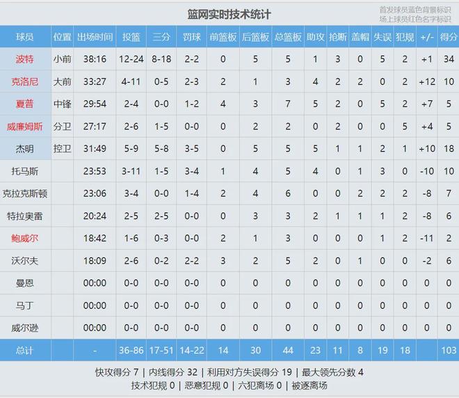 篮网这边,小波特疯狂出手18次三分球。全场比赛,小波特24投12中,三分18中8,罚球2中2,空砍34分5篮板1助攻3抢断5失误,正负值+1。小波特已经连续7场比赛得分20+,他也是篮网队史最快命中100记三分的球员。