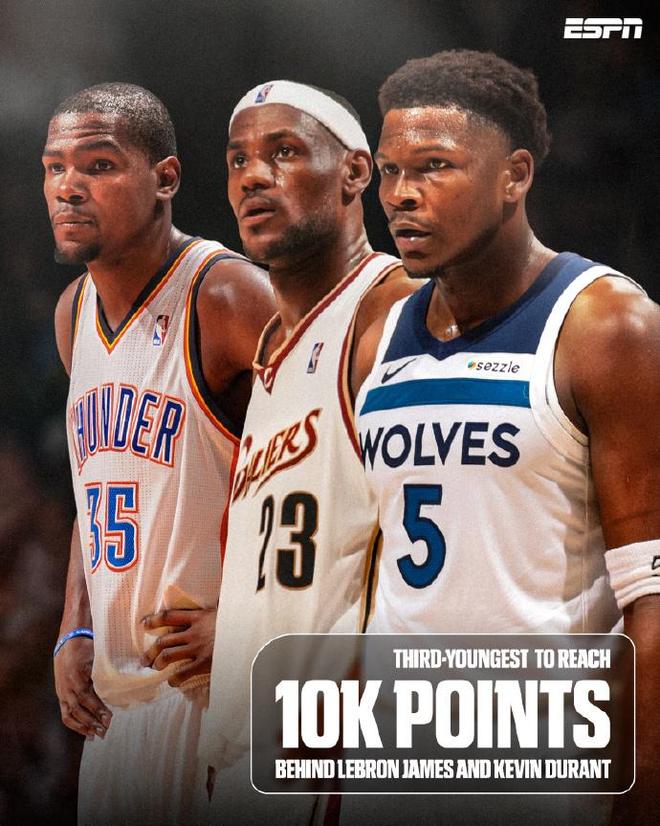 爱德华兹24岁156天成为历史第3年轻的10000分球员,仅次于詹姆斯23岁59天与杜兰特24岁33天,领先科比24岁194天。