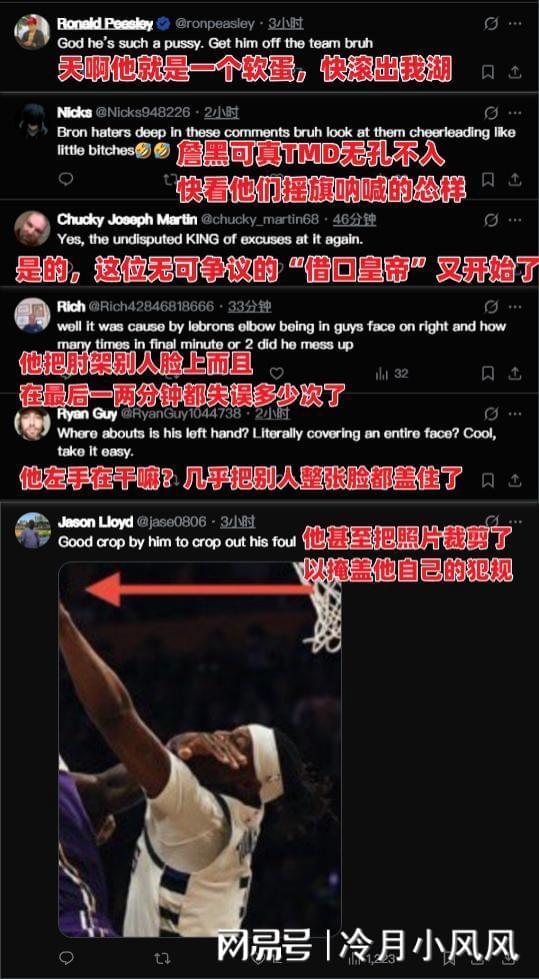 对于詹姆斯的举动,迅速引发了美国网友的大范围嘲讽。有的人说道:“天哪,詹姆斯就是一个软蛋,快滚出我湖。”有的人说道:“这位无可争议的”借口皇帝”又开始了。”有的人则说道:“他在干什么?几乎把手盖住别人的整张脸了。”还有人说道:“詹姆斯把照片裁切了,来掩盖自己犯规的举动。” 那么,你们如何看待詹姆斯这个行为呢?可以在评论区交流探讨。
