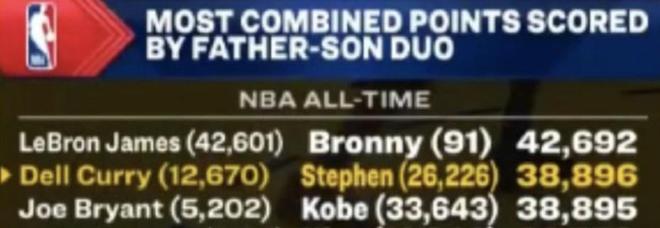 库里父子戴尔-库里与斯蒂芬-库里总得分,超越布莱恩特父子科比与乔-布莱恩特38895分,升至NBA历史父子得分榜第二位,仅次于詹姆斯与布朗尼父子合计42692分。