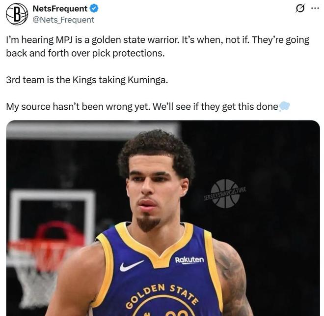 目前双方正在就选秀权问题进行拉扯,勇士将送出26年首轮签,另外一个首轮签大概率将由得到库明加的国王提供。