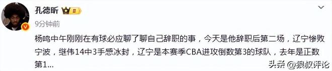 杨鸣中午刚刚在有球必应聊了聊自己辞职的事,今天是他辞职后第二场,辽宁惨败宁波,继伟14中3手感冰封,辽宁是本赛季CBA进攻倒数第3的球队,去年是正数第1。