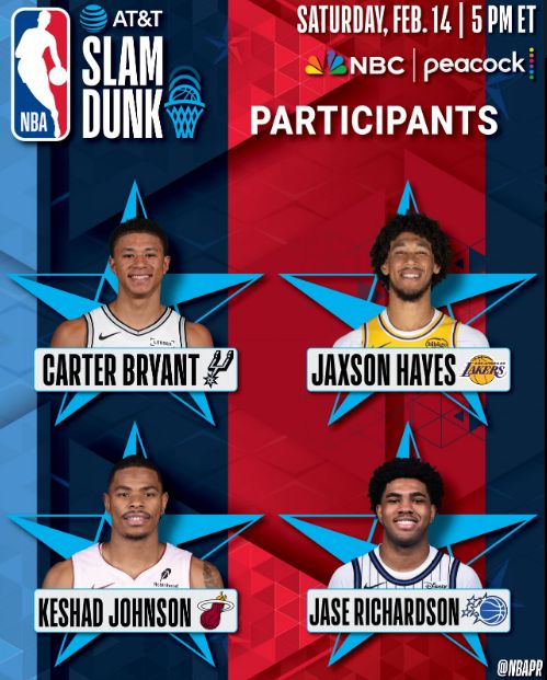 魔术新秀、两届扣篮王杰森-理查德森之子贾斯-理查德森,顶替伤退的杜伦参加扣篮大赛,其余3位参赛选手是湖人中锋海斯,以及热火前锋凯沙德-约翰逊与马刺新秀布莱恩特。