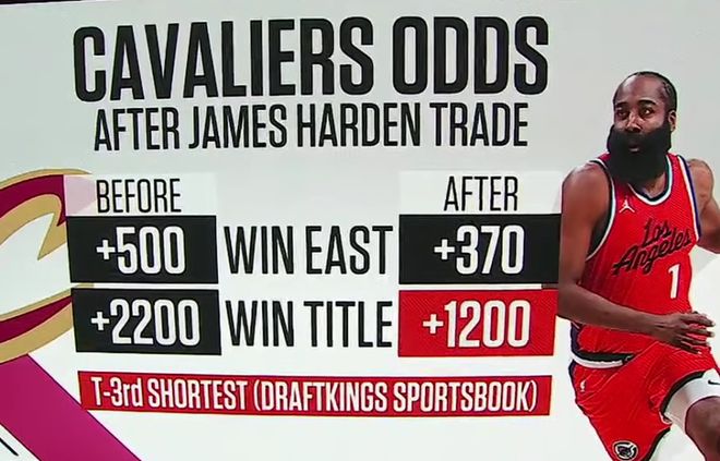 数据显示,哈登交易完成前,骑士夺得东部冠军的赔率是+500(数字越小,越被看好),夺得总冠军的赔率是+2200,而哈登交易完成后,骑士夺得东部冠军的赔率变成+370,夺得总冠军的赔率是+1200。显然,哈登的加盟,让骑士更被看好了。