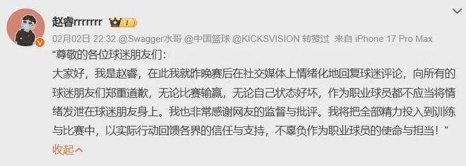 赵睿就发表不当言论向球迷道歉,CBA公告:停赛3场、罚款5万元,北京首钢篮球俱乐部核减联赛经费5万元