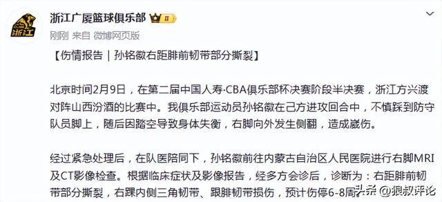 广厦官方:孙铭徽右距腓前韧带部分撕裂 预计伤停6-8周