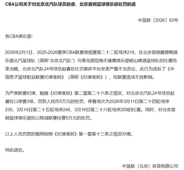 赵睿不当言论被重罚,CBA官宣禁赛3场罚款5万,首钢被罚5万