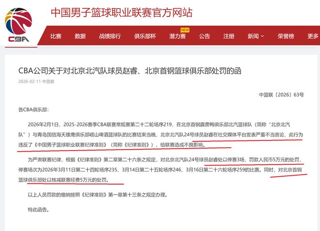 与此同时,CBA公司还对北京队也进行了处罚,核减北京队联赛经费50000元!