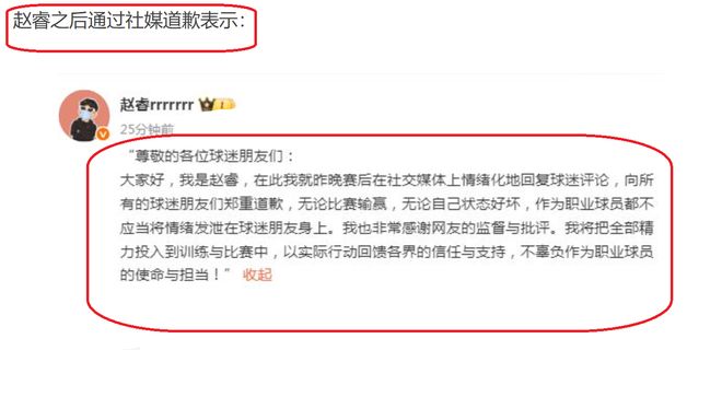 后来,赵睿也是认识到了自己的问题,于是就通过网络平台,向球迷进行道歉,表示自己在输掉比赛之后,情绪化地回应了球迷的评论,很不应该,特地向球迷进行道歉!自己作为一名职业篮球运动员,不管是任何情况下,都不能够将自己的情绪发泄到球迷身上。接下来,自己也会反思,会将所有的精力用在训练和比赛上,同时,也是感谢球迷的监督和批评。