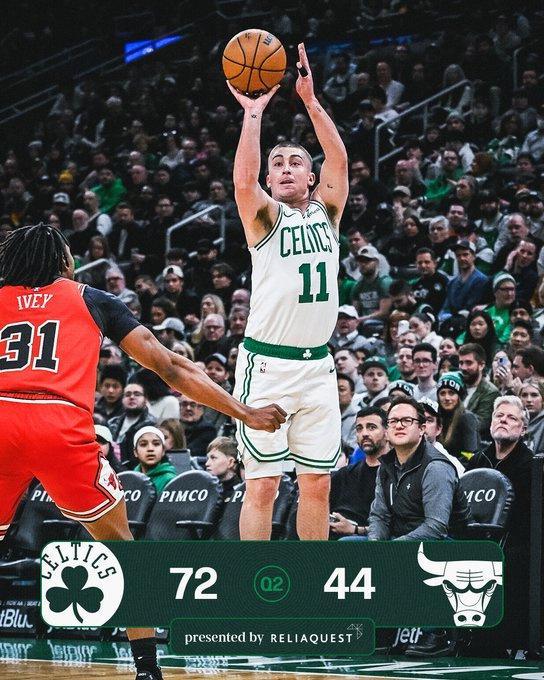 次节比赛,凯尔特人连续两节单节得分35+,且用出色防守限制公牛首次单节不足20分。凯尔特人持续攻防碾压公牛,率先打出一波21-6攻势,已经扩大57-33领先24分优势。凯尔特人之后继续扩大70-41领先优势,公牛略有反扑追分,上半场结束凯尔特人扩大72-44领先公牛28分优势。前两节比赛,凯尔特人48中28接近6成准星,其中三分19中10,布朗18分、普里查德16分与武切维奇10+6;公牛三分17中6,全队没有球员得分上双。