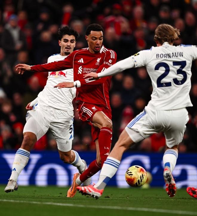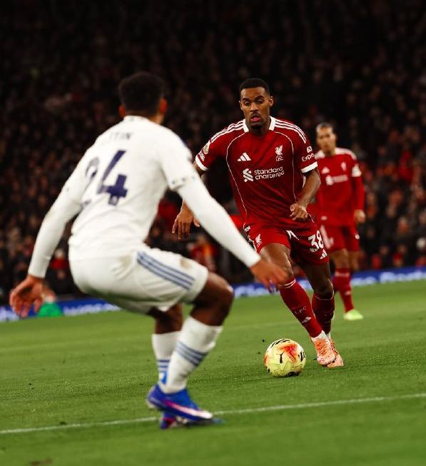 面对赛季首回合交锋逼平自己的利兹联,利物浦此役在主场不敢有丝毫保留,在4231的阵型中,让阿利森镇守龙门,罗伯逊、范戴克、科纳特和布拉德利构筑后防,琼斯和赫拉芬贝赫搭档双后腰,维尔茨、索博斯洛伊和弗林蓬坐镇中场,单箭头则是埃基蒂克。