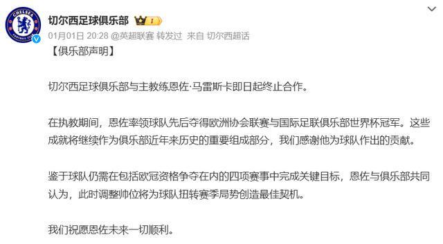 先来看看切尔西的神操作,1月1日晚上的一则消息,令多少球迷会心一笑。切尔西足球俱乐部官方宣布,与主教练马雷斯卡终止合作。