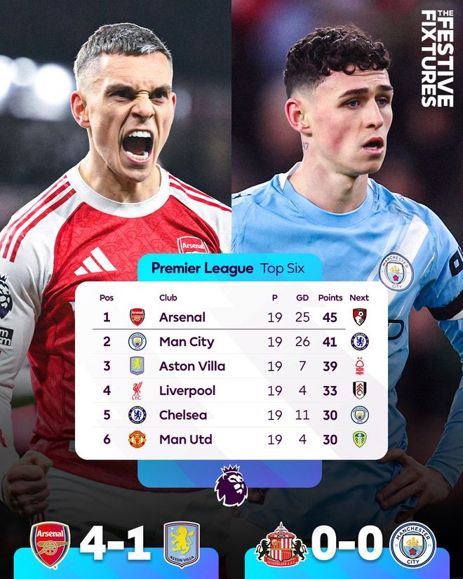01月02日讯 英超第19轮比赛全部战罢,曼城0-0桑德兰,阿森纳4-1战胜维拉。阿森纳领先优势扩大到4分。