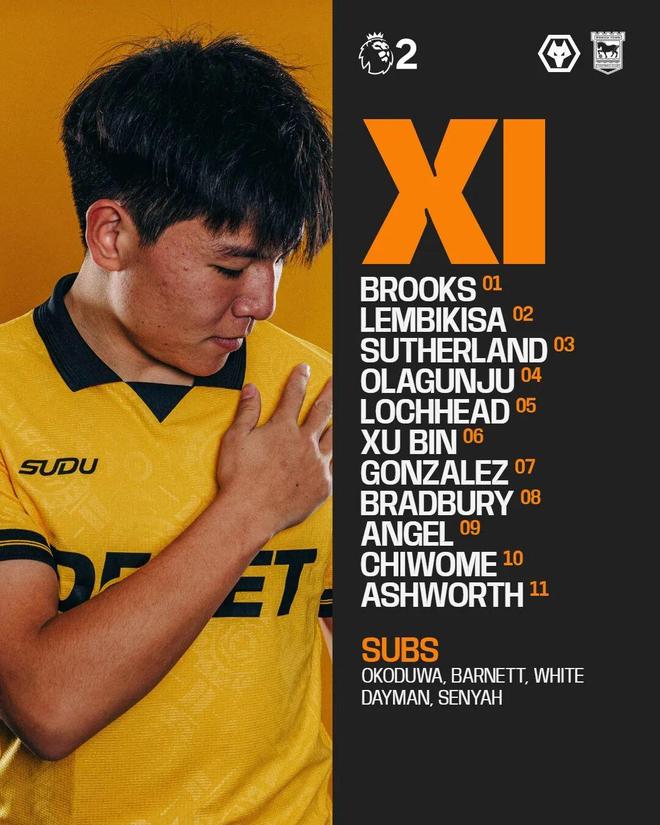 狼队对徐彬的首秀足够重视,赛前首发名单海报以徐彬为主角,徐彬身穿6号球衣出场,比赛还吸引了一些中国球迷到场观战。此役对手是英超2联赛排名第4的伊普斯维奇U21队,实力很强。而且还有小雨,比赛天气条件并不理想。但徐彬没有怯场,很快进入状态。开场2分钟徐彬高位上抢,迫使伊普斯维奇U21队后场传球失误,队友安赫尔吊射迎来梦幻开局。第27分钟狼队冈萨雷斯攻入第3球后,徐彬也与进球队友击掌庆祝。