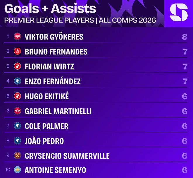 2026赛季英超球员所有赛事进球+助攻榜(前十)