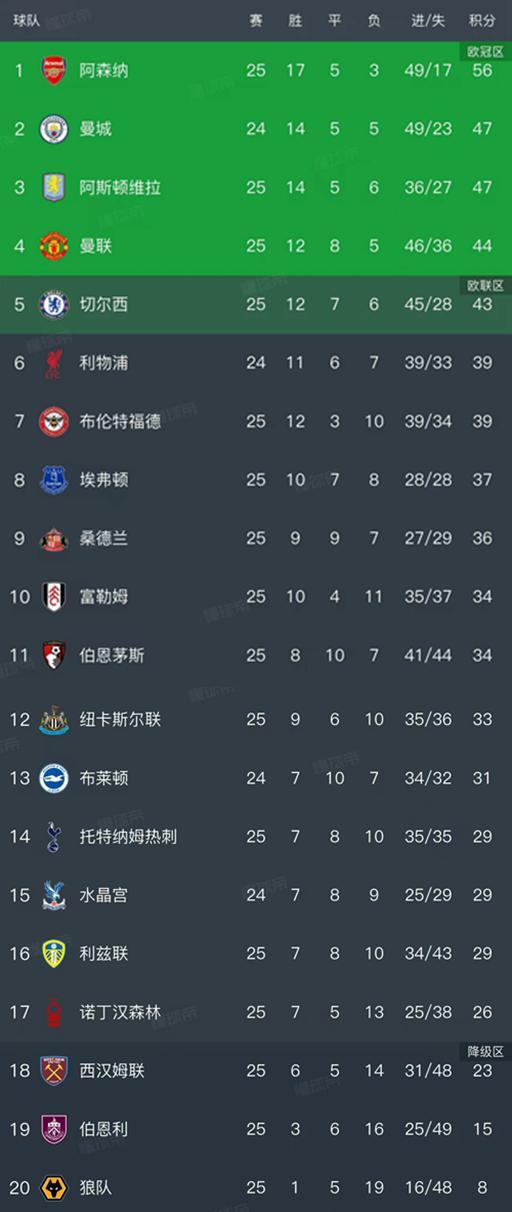 英超最新积分榜