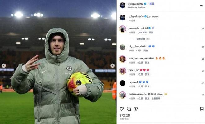 赛后,帕尔默成功被球迷票选为本场比赛最佳球员,他也通过社交媒体晒出自己怀抱比赛用球、比出“3”手势的照片,配文“只管享受!”,言语间难掩获胜后的喜悦与自信。