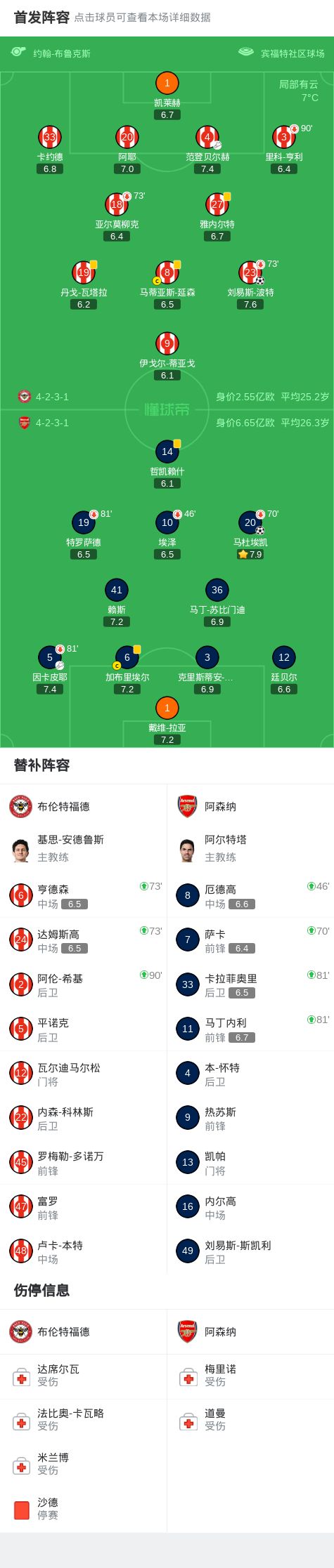 北京时间2月13日英格兰足球顶级联赛 联赛 第26轮,布伦特福德主场对阵阿森纳。上半场拉亚神扑救险,加布里埃尔、哲凯赖什染黄,下半场马杜埃凯头球破门,波特扳平比分,马丁内利失单刀。最终比分布伦特福德 1-1 阿森纳。