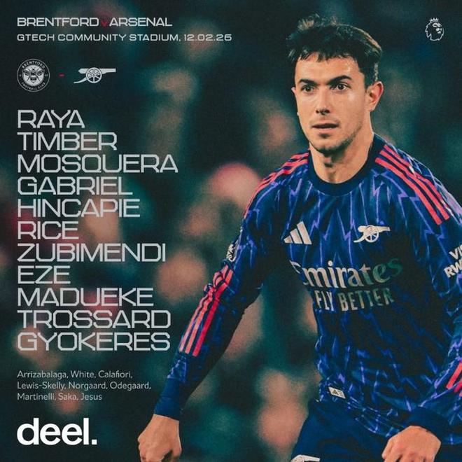 阿森纳客战布伦特福德:埃泽首发,苏比门迪、马杜埃凯出战